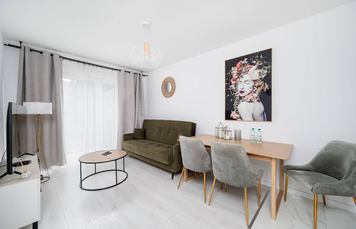 A modern 75m2 apartment in the Szermiercza street segment in Lodz. It consists of a spacious living room with kitchenette and dining area, a bedroom with double bed, a children's room with 2 beds and desk, 2 bathrooms, a wardrobe and a utility room. Large terrace, free parking under the building. Quiet, green neighborhood; close to a tram stop. 20 minutes to the city centre. Fully equipped (smart TV, cooker, oven, dishwasher, coffee machine, washing machine). Come and see yourself!