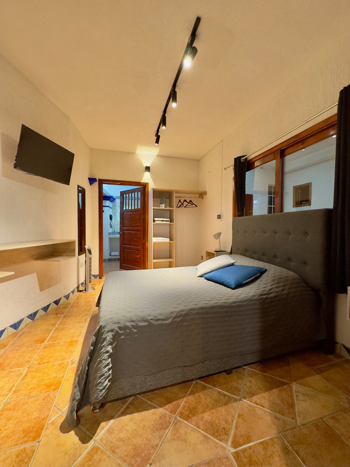 Descubre un loft acogedor y moderno, ideal para parejas, amigos o viajeros. A minutos del centro, combina estilo industrial y calidez con techos y muebles de madera, iluminación suave y plantas naturales. Sala con sofá de piel y mesa de madera para charlas o cenas. Cocina equipada con cafetera, freidora, parrilla y frigobar. Dormitorio con cama flotante y Smart TV. Cuenta con regadera eléctrica. Jardín compartido ideal para disfrutar al aire libre. Permite música moderada hasta las 2 am.