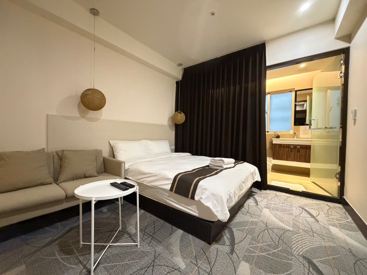 室內的灰白主色,配搭北美木紋銅色傢俱及家飾, 用心為您的居住空間提供沈靜優雅的感覺。日韓系電器的選用,不論是無線充電藍牙喇叭 ,大螢幕伸縮高清電視 ,都能滿足您對影音效果的要求。房源位於高樓內縮樓層,阻絕不必要的噪音並滿足您對景觀 ,安靜及隱私的要求。大樓並配有全天候警衛,住戶專屬電梯 ,公用大露台 ,以及地下收費停車場, 位處西門町核心路段,無論搭乘捷運或自駕都非常方便。El diseño interior basado en el tono de la tierra ofrece una atmósfera cálida, tranquila, curativa y encantadora. Instalaciones de la habitación, incluyendo cama doble, baño privado con ducha, aire acondicionado, televisor inteligente 4K con películas/Netflix, Internet WIFI, iluminación de la cala y reproductor de música con conexión inalámbrica y puertos de cargador USB.