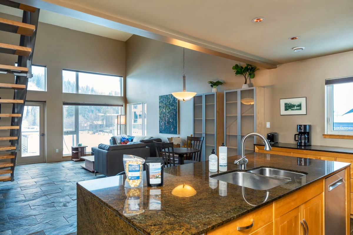 This luxury 700 square foot 1-bedroom 1-bathroom condo is located in the center of downtown, directly beside the Yukon River and Shipyards Park. Near Whitehorse's most popular coffee shops and bars, this condo is perfect for professionals and travelers wanting to be in a convenient and trendy downtown location. The condo features a spacious balcony and a bright open concept kitchen and living room. The bedroom has a queen-sized bed with soft linens and comfortable pillows.