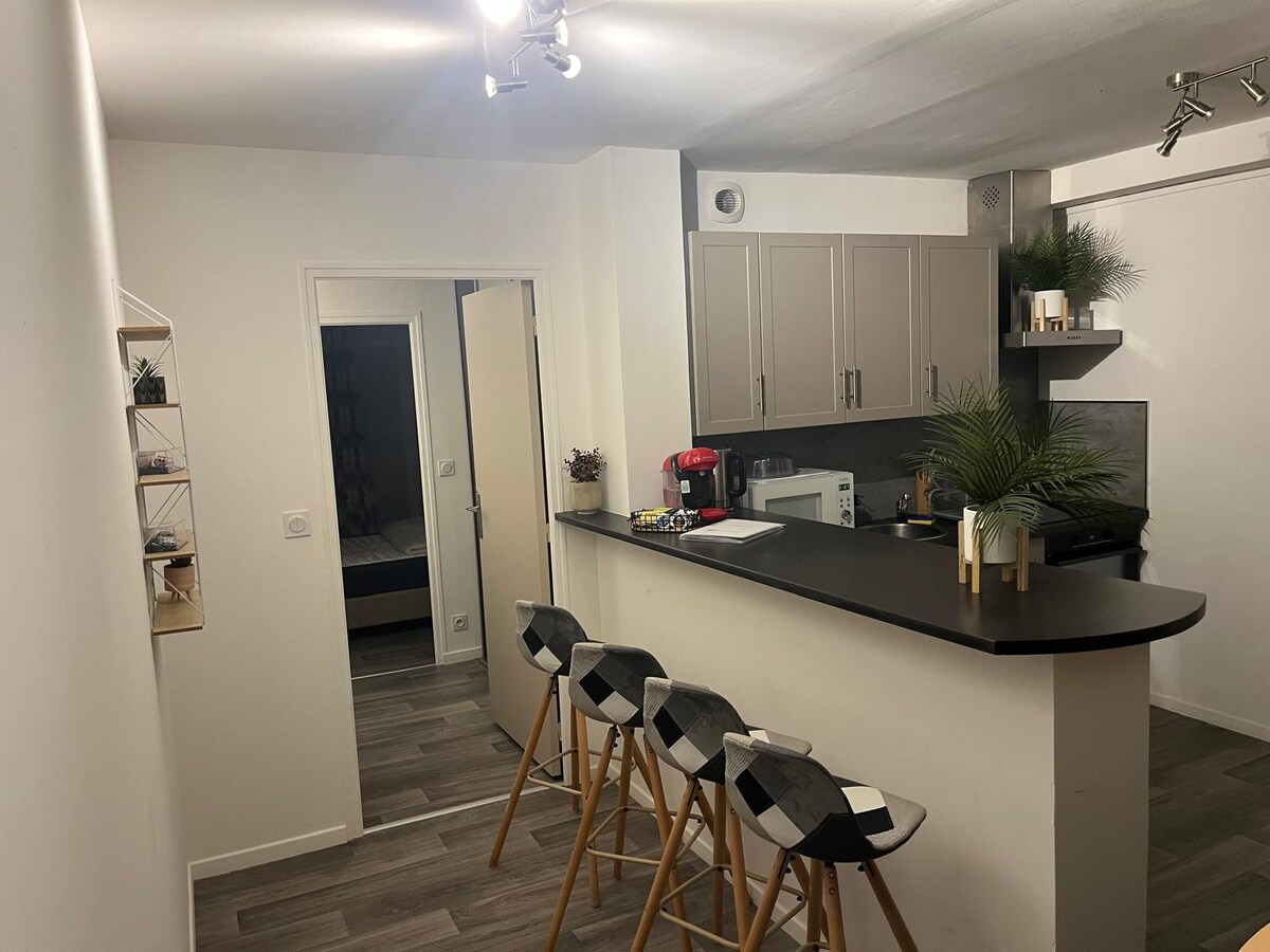 Estudio cálido y moderno situado cerca de múltiples tiendas y a 15 minutos a pie del centro de la ciudad de Le Mans. Bienvenido a mi apartamento situado en el tercer piso con ascensor en una residencia tranquila. Una plaza de aparcamiento privado en la urbanización está a su disposición. Este estudio consta de una amplia sala de estar con una bonita cocina abierta equipada, con café, té y condimentos a su disposición. También dispone de un baño con bañera.