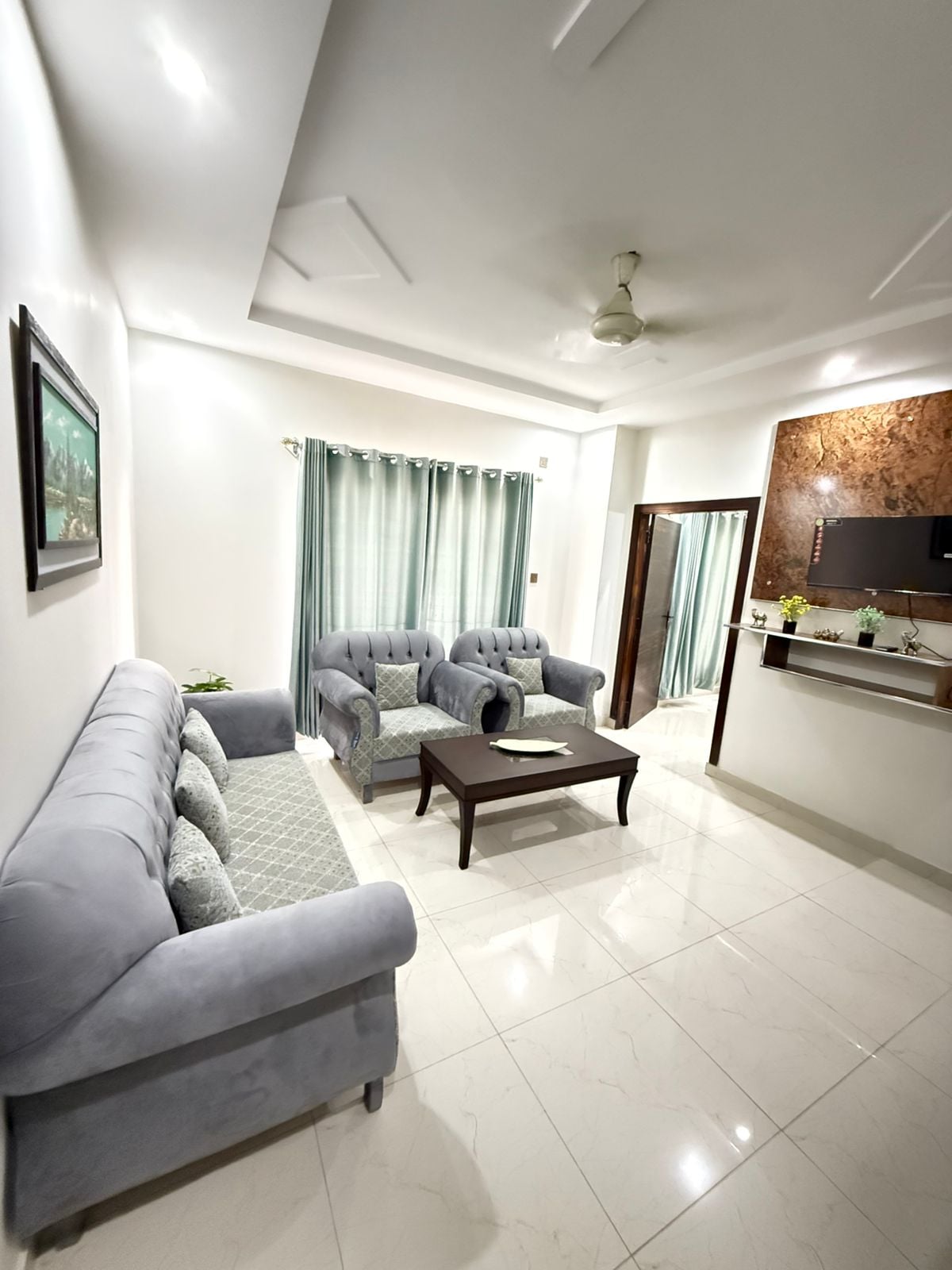 Modern Flat at Kohistan Enclave, Wah Cantt offers a comfortable and well-designed living space featuring one bedroom, one bathroom, and a spacious living room. A private terrace provides a relaxing outdoor retreat, while the balcony overlooks the garden, adding a pleasant, refreshing view. This is a family-only apartment. Single guests are welcome, and to maintain a comfortable environment for all residents, unmarried couples are kindly not accommodated.