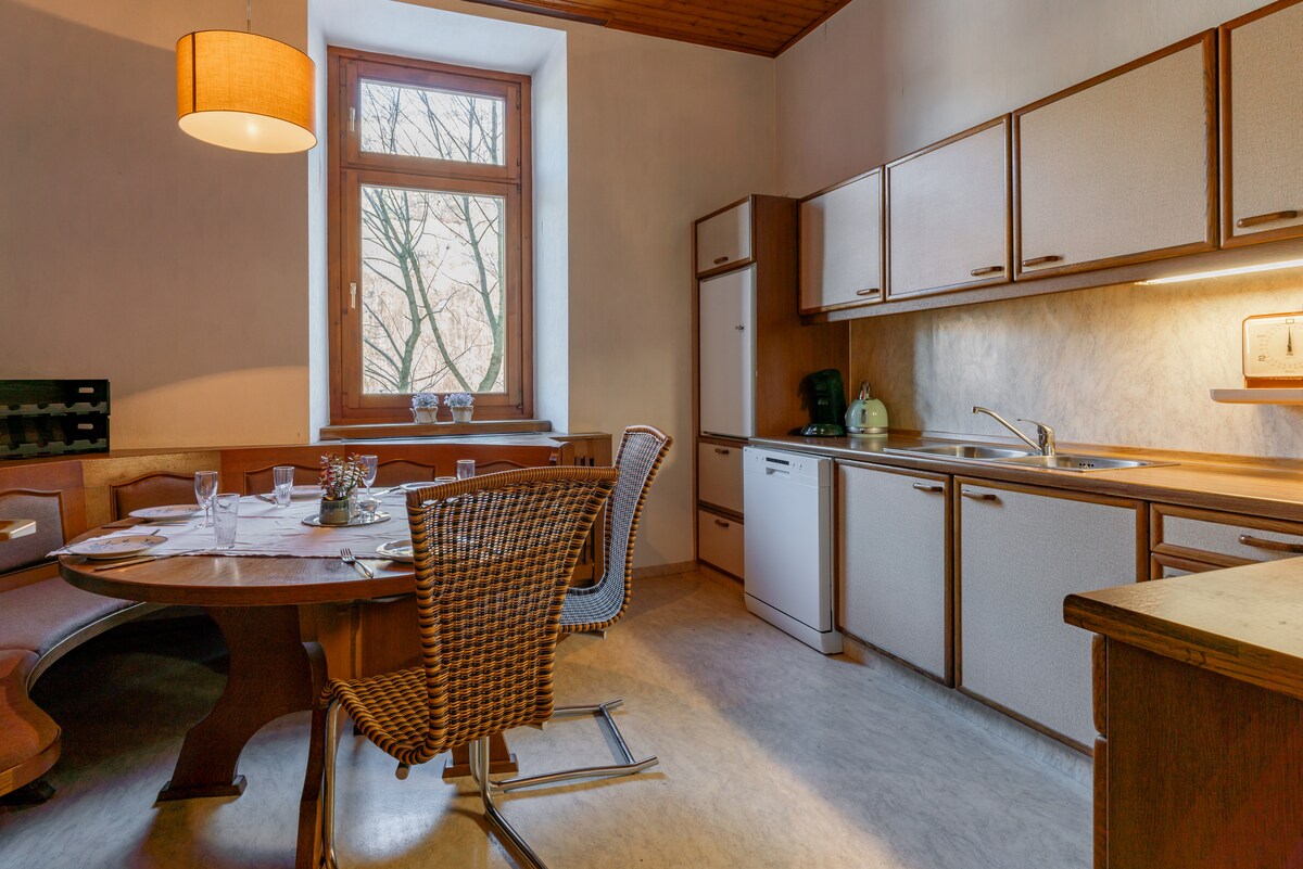 Disfrute de hermosos días en la Kaiserhaus con jardín y maravillosas vistas a las montañas. Una casa de madera de 200 años de antigüedad fue derribada cerca de aquí y reconstruida al lado de mi casa. La nueva (antigua) casa de madera se ha restaurado de forma muy ecológica y de última generación. El salón imperial se ha revestido casi exclusivamente con madera vieja y nueva, y todavía se puede apreciar la artesanía antigua. Sin embargo, también se han incorporado elementos modernos como un proyector y el control por voz de Alexa. Hay plazas de aparcamiento disponibles.