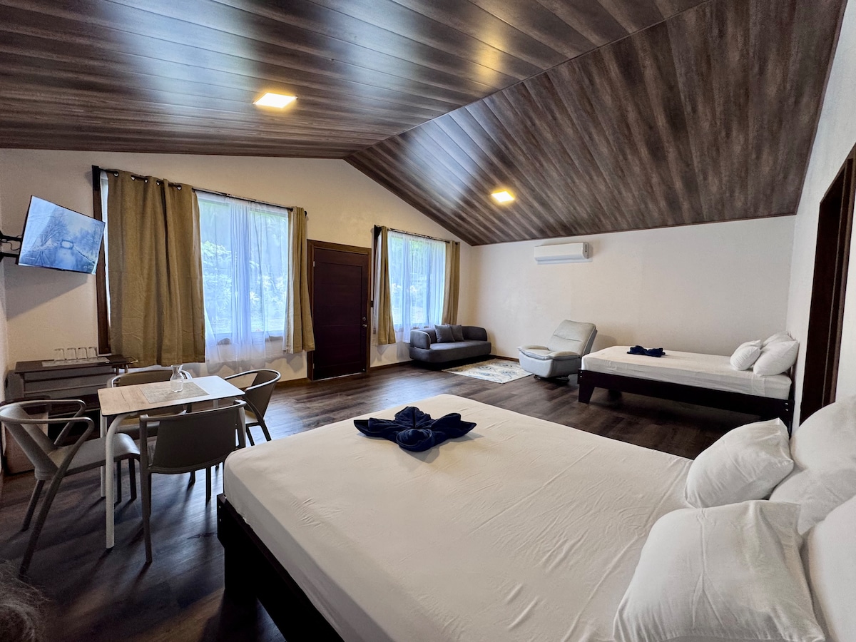 Hotel Boutique Casa del Río Amplia habitación con cama tamaño king, cama doble y cocina americana, perfecta para parejas o familias pequeñas. Cuenta con balcón privado con vistas al río, aire acondicionado, wifi, TV inteligente y baño con agua caliente. Los huéspedes tienen acceso a todos los servicios del hotel: restaurante, piscinas, jacuzzis, gimnasio, cancha de baloncesto, tres canchas de pádel y una piscina semiolímpica. Desayuno incluido en nuestro restaurante con vistas al volcán Arenal.