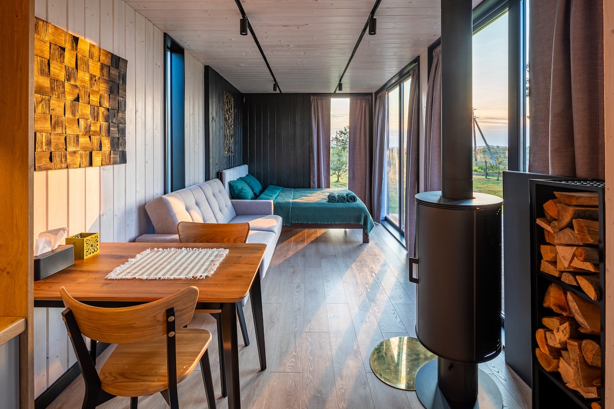 La unidad con la naturaleza se siente mejor en la cabaña junto al bosque. Hay conejitos corriendo, docenas de pájaros volando, ardillas saltando, arbustos de arándanos y moras en flor. Y dentro de la casa, todo lo que necesitas para unas vacaciones de calidad: ventanas panorámicas, una gran cama con almohadas de cáñamo y una manta, una estufa con leña, una cómoda cocina, una ducha de efecto lluvia con una vista fantástica de la puesta de sol. Una terraza con una zona de relajación, un tazón de fuego y una taza (tina) también están a tu servicio en cualquier momento.