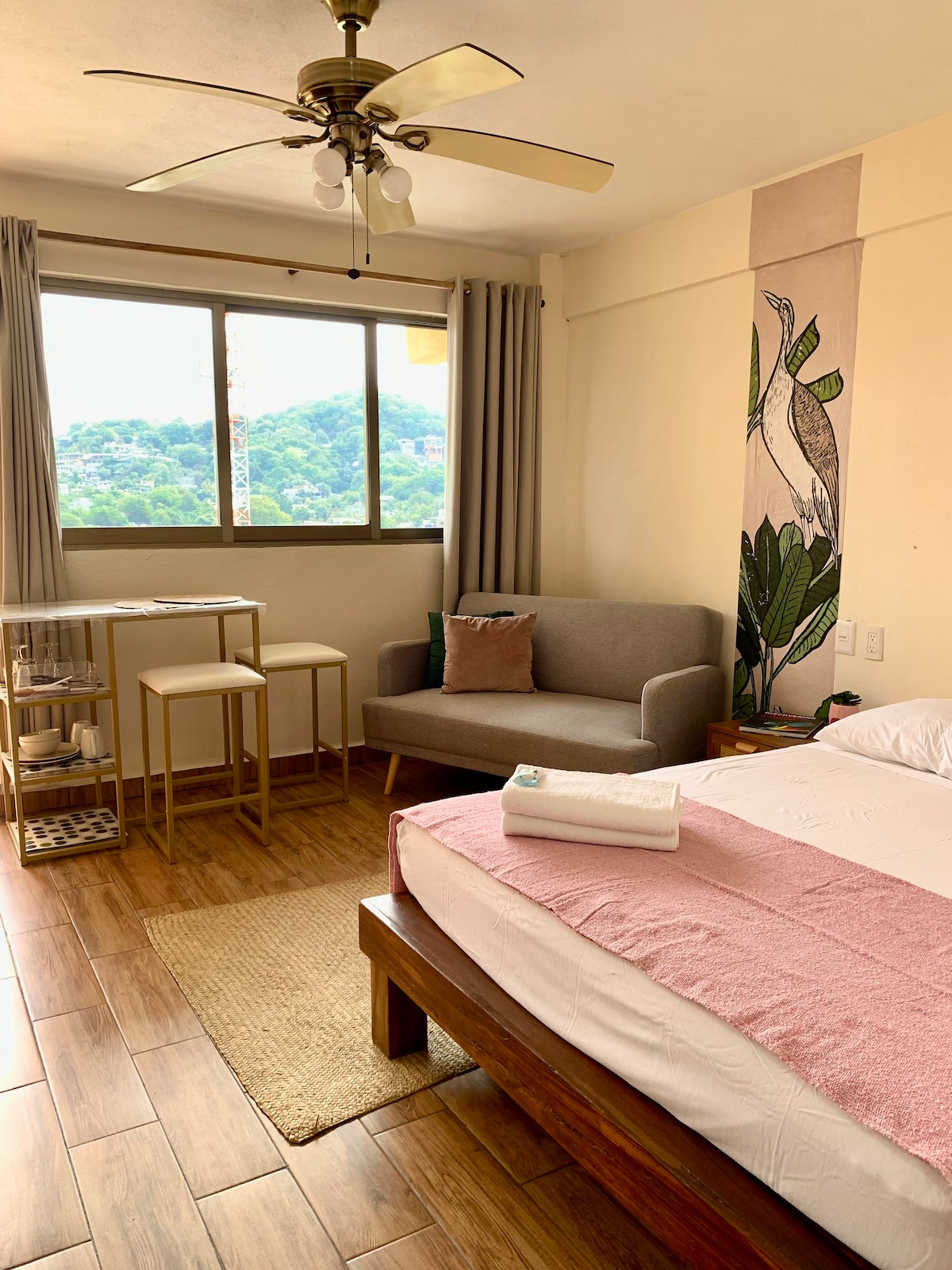 Disfruta de nuestro alojamiento completamente nuevo, tranquilo, apartamento tipo studio con vista a la bahía de Zihuatanejo, terraza privada, piscina con infinito, asoleadero con camastro y sombrillas, y además un acceso con árboles de gran tamaño que te hara sentir en contacto con la naturaleza.