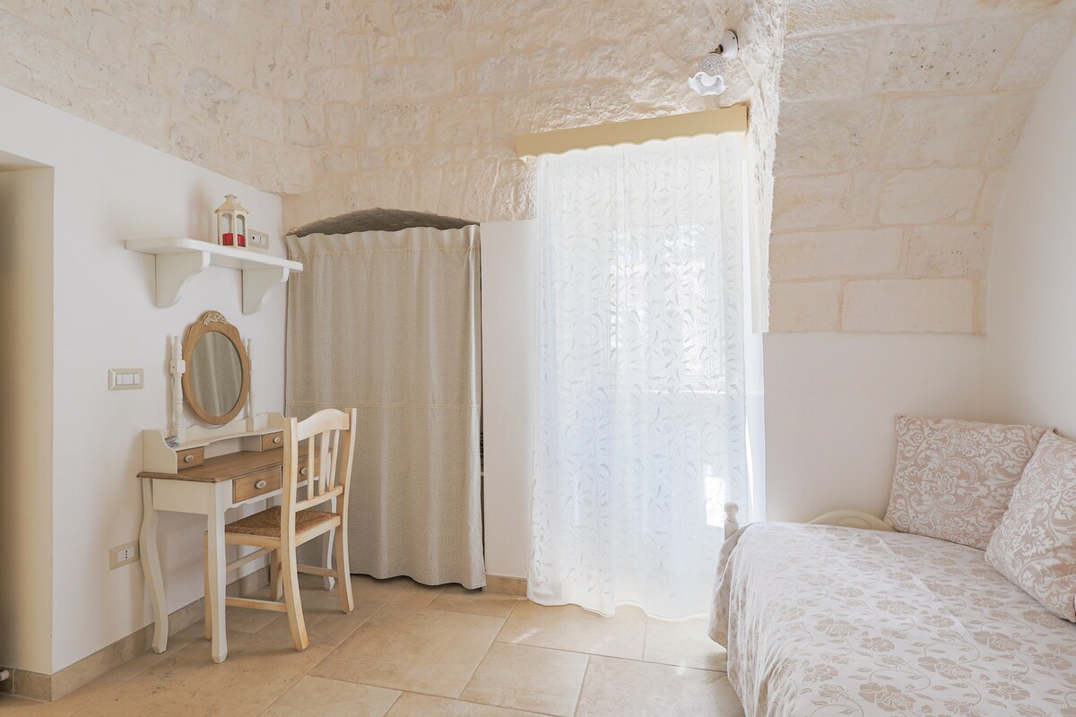 La casa è un trullo del 1800, tutto ristrutturato, dotato di riscaldamento ed aria condizionata, Smart TV e WI-FI. La camera da letto è dotata di un letto matrimoniale con comodini, lampade da lettura e armadio. Nella sala, dotata di frigo, forno microonde, tostapane e macchina espresso caffè, è sistemato un divano letto; è possibile cucinare e pranzare su tavolo per 4 persone. Dalla sala si accede al bagno dotato di lavatrice, acqua calda, tutti i sanitari WC, lavabo, bidet, doccia con cabina.