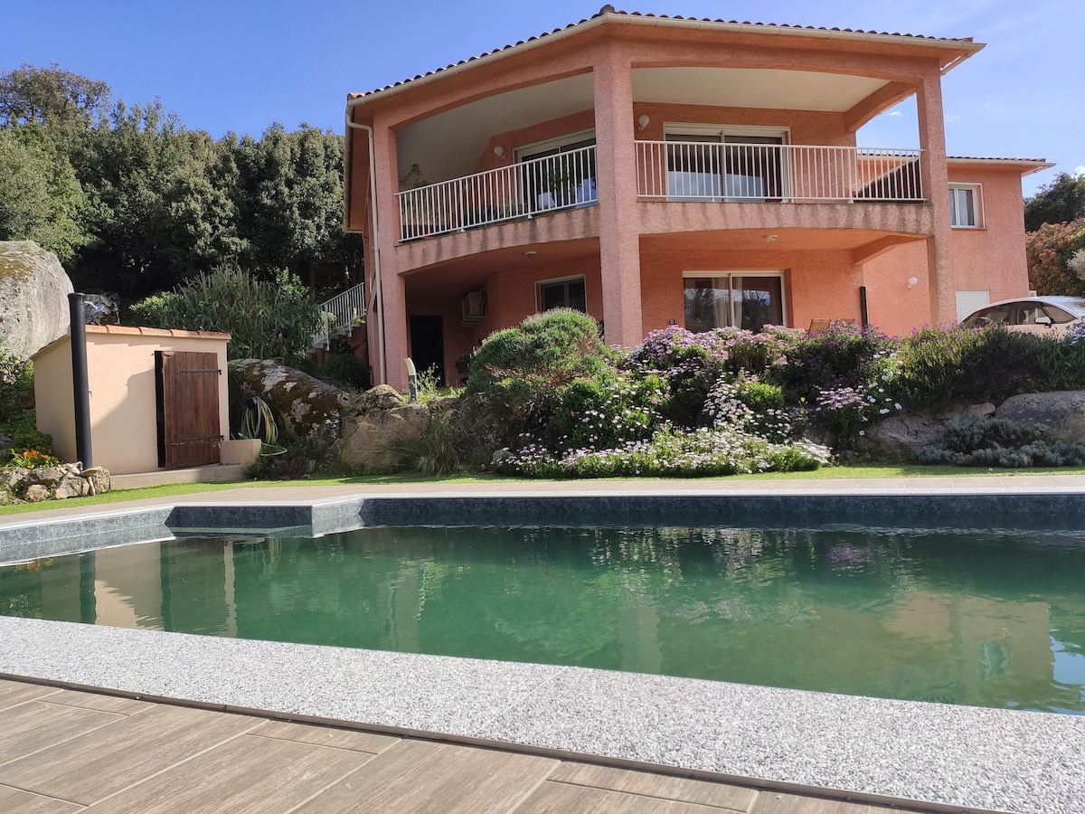 Pequeño pedazo de paraíso tranquilo con vistas a Porto Vecchio y su golfo . Situada entre el mar y la montaña, con piscina privada, totalmente equipada y con aire acondicionado, la casa consta de una sola habitación principal de 40 m² y un baño, ideal para una pareja. Cerca de Porto Vecchio, a 6 km (en dirección a la montaña) y hermosas playas como Palombaggia y Santa giulia.También cerca del bosque del hospital con su cascada de piscia di gallo dirección Bavella.