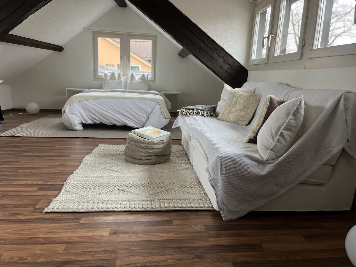 Encantador y acogedor loft en la azotea en estilo chalé con una vista increíble sobre los tejados de Zúrich en el corazón de la ciudad con estilo de casco antiguo - 100 m de la calle comercial principal Bahnhofstrasse. Casi no puedes estar mejor y más céntrico. Disfruta de estar en el corazón de Zúrich y descubre todos los grandes puntos destacados de la ciudad a poca distancia y a solo 400 metros de la estación principal de Zúrich HB. El apartamento tiene todas las comodidades y servicios para una gran estadía. Tengo muchas ganas de darte la bienvenida. 🙏🍀😊